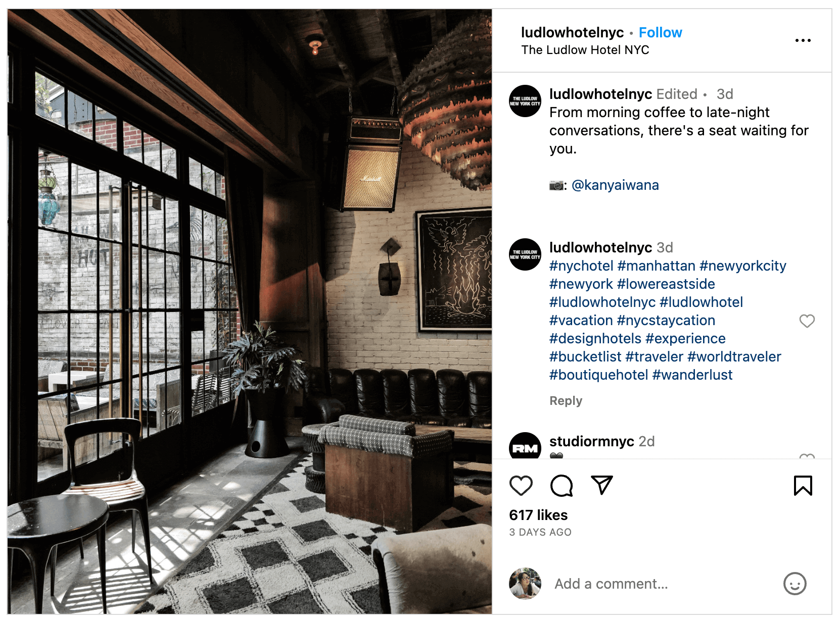 Die Pflege aktiver Social-Media-Profile auf Plattformen wie Facebook, Instagram und LinkedIn kann die Online-Sichtbarkeit Ihres Hotels erhöhen. Das Posten ansprechender Inhalte und Updates hilft potenziellen Gästen, das Hotel zu entdecken und über seine Angebote auf dem Laufenden zu bleiben. Schauen Sie sich an, wie Das Ludlow Hotel NYC nutze soziale Medien: